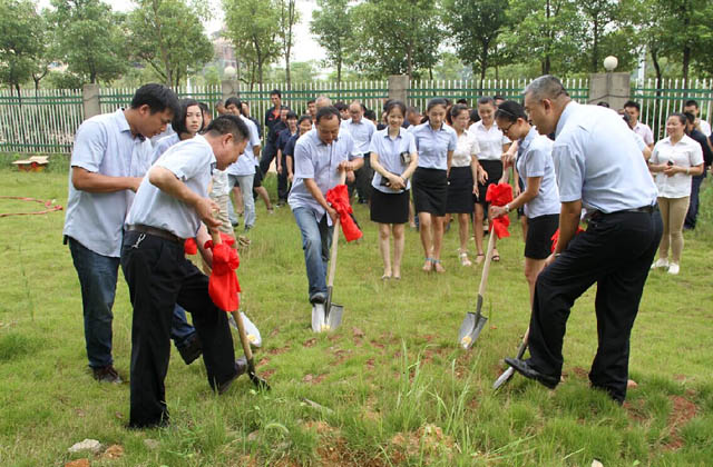 公司老总们在试验塔建设地址动锹培土。